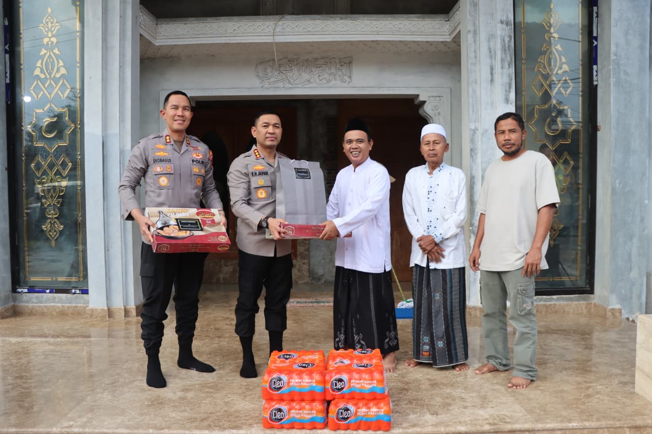 Suasana kebersamaan terlihat hangat saat aparat dan warga berbaur membagikan takjil serta berdialog santai di lingkungan masjid.