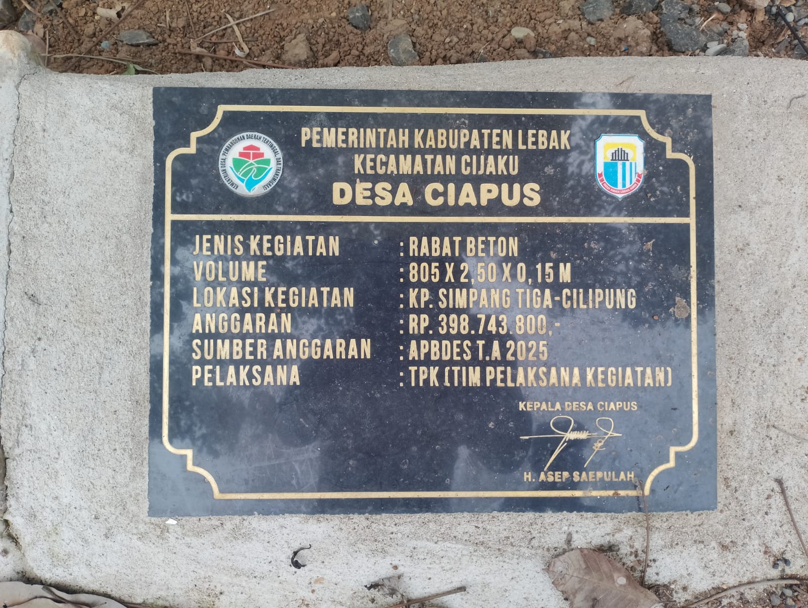 LEBAK, Sekitartangerang Diduga tidak Sesuaian Pembangunan Jalan Poros Desa Ciapus Kecamatan Cijaku kabupaten Lebak provinsi Banten. Terlihat jelas Jalan rabat beton tersebut, Yang baru di bangun beberapa bulan sudah amburadul diduga Pengerjaan asal-asalan serta memanipulasi matrial. jenis kegiatan rabat beton, Volume : 805 x 2, 50 x 0,15 CM lokasi kegiatan kp simpang tiga-ciapus, Anggaran : Rp.398.743.800, yang bersumber dari anggaran APBDES T.A 2025. Tim pelaksana kegiatan (TPK).sehingga hasil pantauan lapangan tersebut diindikasi Jalan poros memang Sudah terlihat jelas keadanya sangat prihatin.