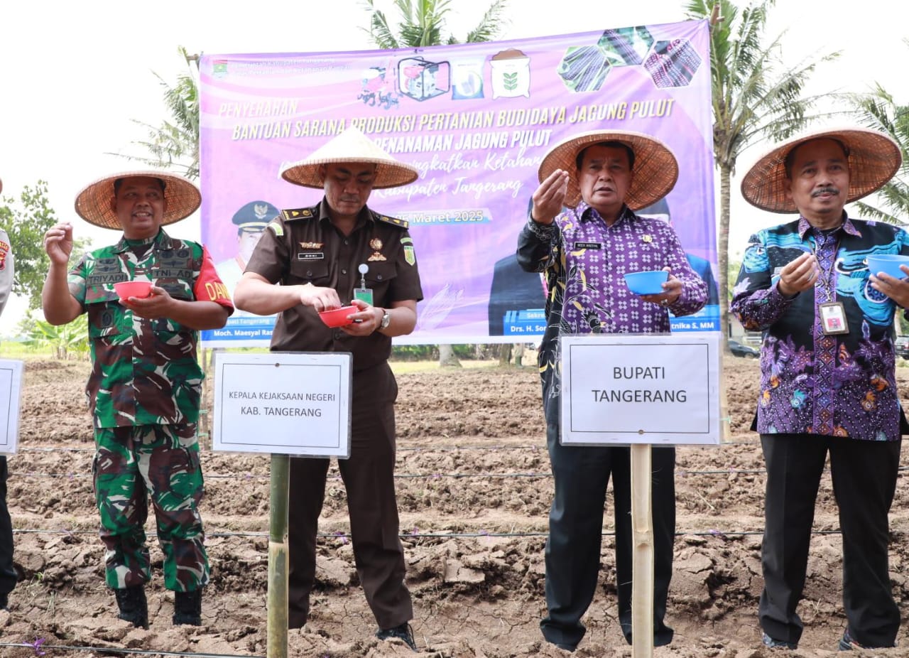 TANGERANG KABUPATEN, Sekitartangerang Bupati Tangerang Moch Maesyal Rasyid menyerahkan bantuan sarana produksi pertanian serta melakukan penanaman jagung pulut di Desa Kaliasin, Kecamatan Sukamulya, Kamis (6/3/25).