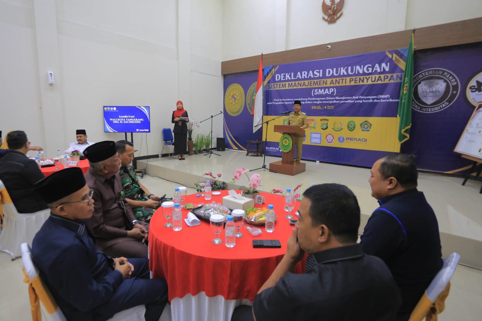 TANGERANG KOTA, Sekitartangerang Dalam rangka memperkuat integritas dan tata kelola pemerintahan yang bersih dan bebas dari praktik korupsi, Wali Kota Tangerang, H. Sachrudin, menghadiri acara Penandatanganan Deklarasi Dukungan Sistem Manajemen Anti Penyuapan (SMAP) yang diselenggarakan oleh Pengadilan Agama Kota Tangerang, Selasa (29/07/2025).