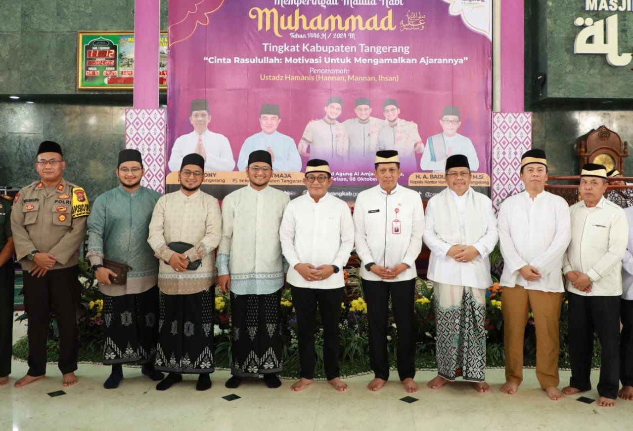 KABUPATEN TANGERANG,–Sekitartangerang Penjabat (Pj) Bupati Tangerang, Andi Ony menghadiri peringati Maulid Nabi Muhammad SAW 1446 H yang bertema “Cinta Rasulullah: Motivasi untuk Mengamalkan Ajarannya”. Acara yang digelar Pemkab Tangerang dalam rangka HUT ke-392 tersebut diselenggarakan di Masjid Agung Al-Amjad, Pusat Pemerintahan Kabupaten (Puspemkab) Tangerang, Selasa, (8/10/24).