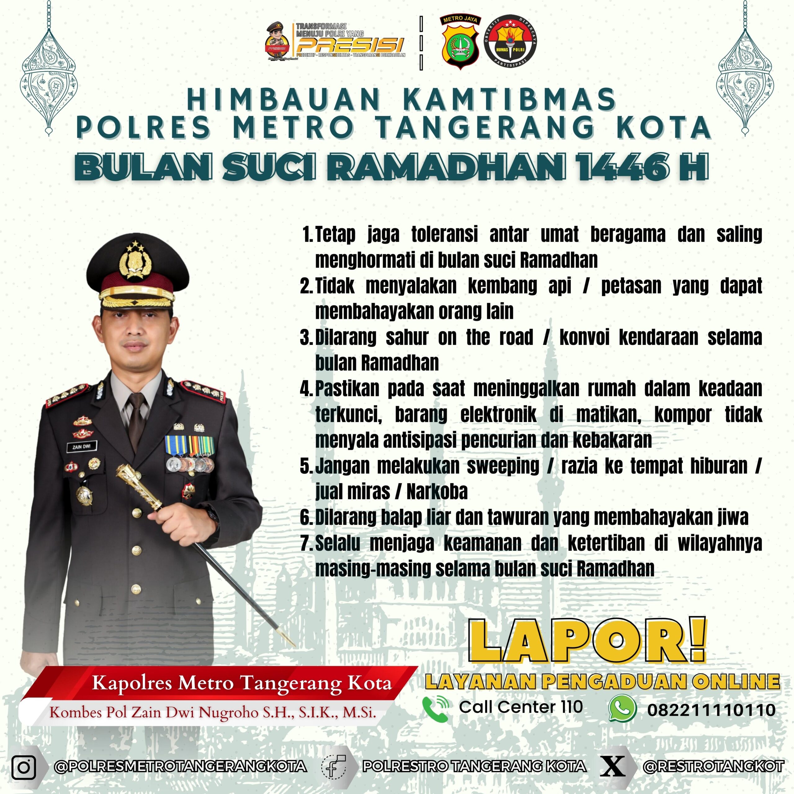 TANGERANG KOTA, Sekitartangerang Selaras dengan Pemerintah daerah (Pemda). Kapolres, KBP Zain Dwi Nugroho mengimbau masyarakat di Wilayah Hukum Polres Metro Tangerang Kota, Polda Metro Jaya, melarang segala kegiatan yang dapat mengganggu keamanan, kenyamanan dan ketertiban selama pelaksanaan ibadah bulan suci Ramadhan 1446 Hijriah/2025 Masehi.